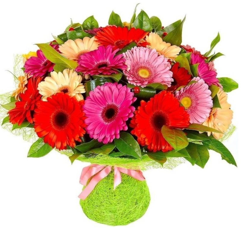 Букет состоит из MIX из 25 гербер, аспидистра, салал, красивая упаковка, атласная лента.
