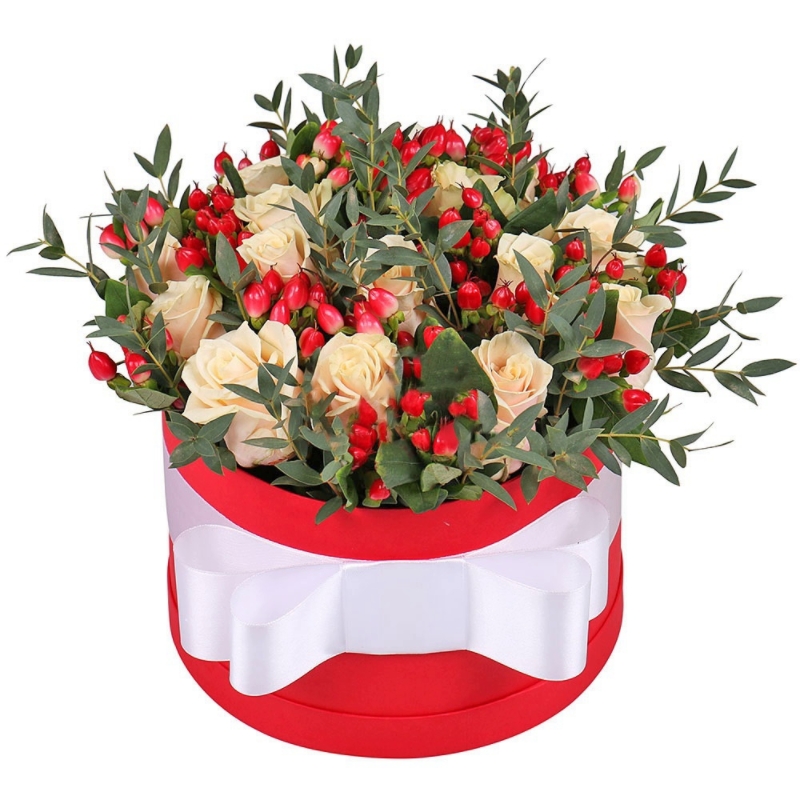 Букет состоит из 15 кремовых роз, 6 веток гиперикума, эвкалипт, коробка, оазис, атласная лента.