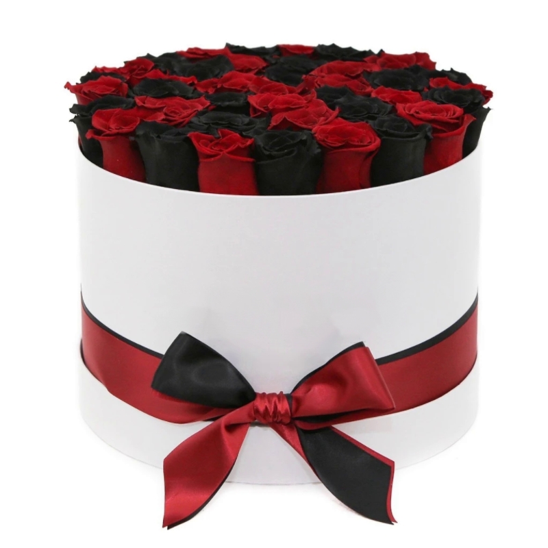 Букет состоит из 20 красных роз, 19 черных роз, коробка, оазис, атласная лента.