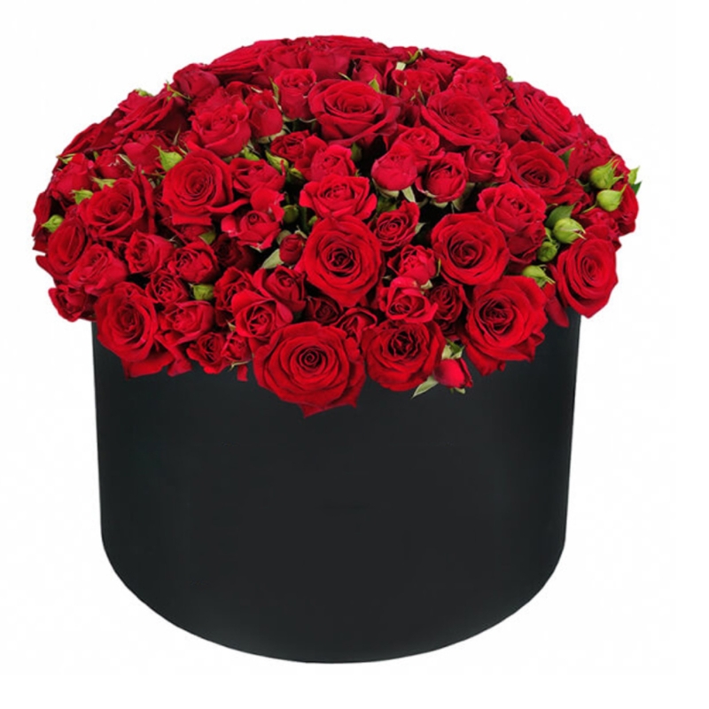 Букет состоит из 35 красных роз, 20 кустовых роз, коробка, оазис.