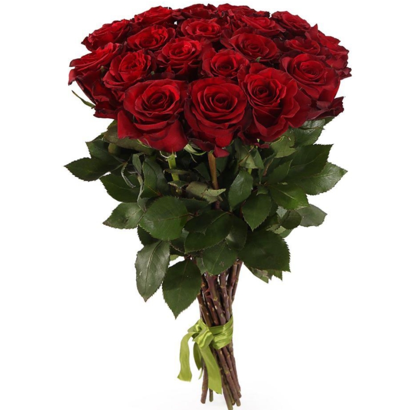 Букет состоит из 19 красных роз, прозрачная упаковка, атласная лента.
